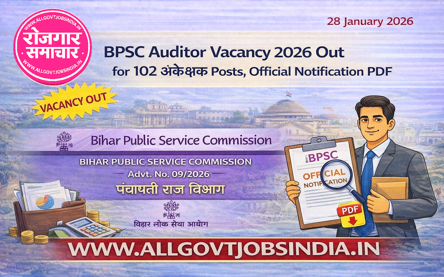 Short Information: The Bihar Public Service Commission (BPSC) has released the notification (Advt. No. 09/2026) for the recruitment of 102 Auditor (अंकेक्षक) posts under the Panchayati Raj Department. Candidates having a degree in Commerce, Economics, Maths, or Statistics can apply online from 5th February 2026 to 26th February 2026 at bpsc.bihar.gov.in. Read below for vacancy details, eligibility, exam pattern, and direct links.