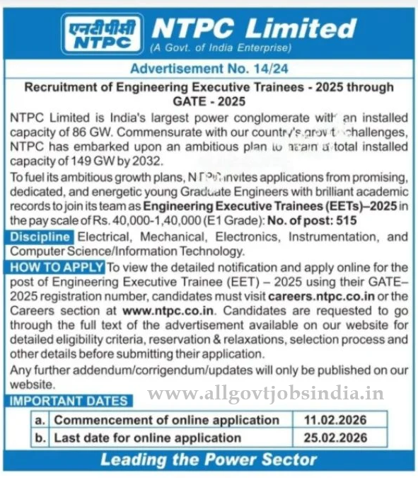 Short Information: National Thermal Power Corporation (NTPC) Limited has released an official notification for the recruitment of 515 Engineering Executive Trainees (EET-2025) through GATE-2025 Scores. Interested and eligible candidates with a B.E./B.Tech degree can apply online from 11th February 2026 to 25th February 2026 at the official website ntpc.co.in. Read below for vacancy breakdown, eligibility, salary, selection process, and direct application links.