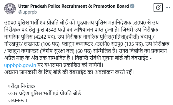UP Police Sub Inspector SI Short Notice | Click Here |